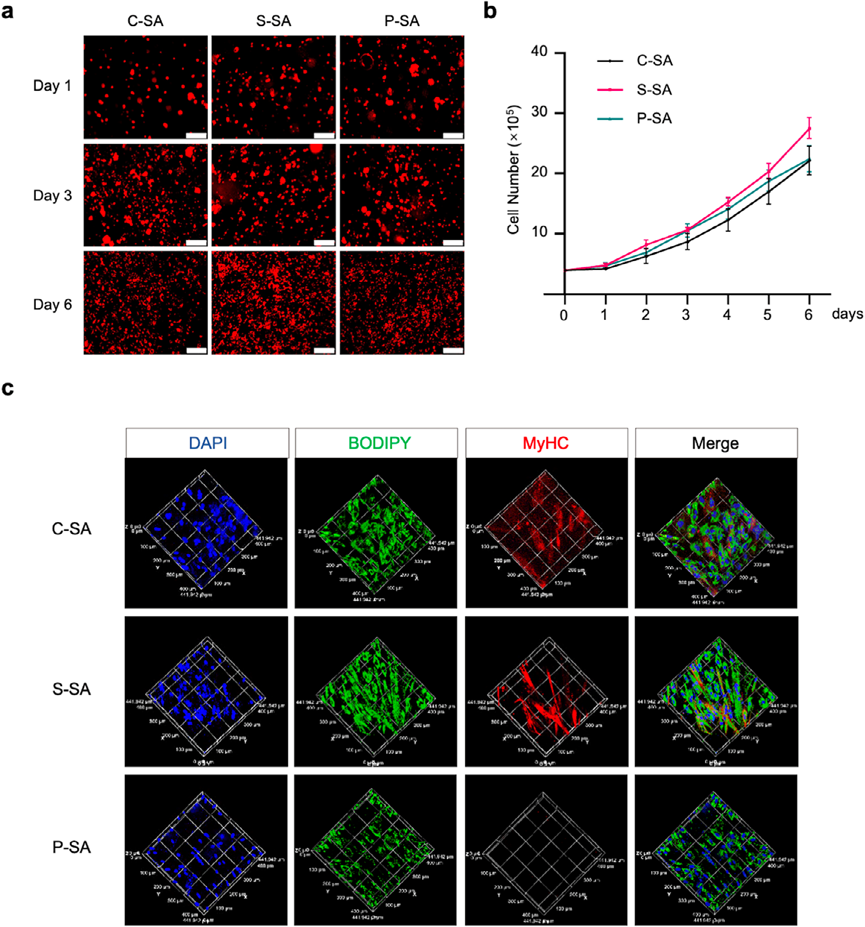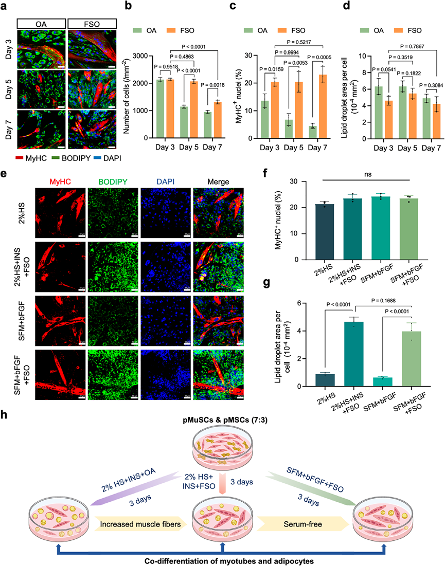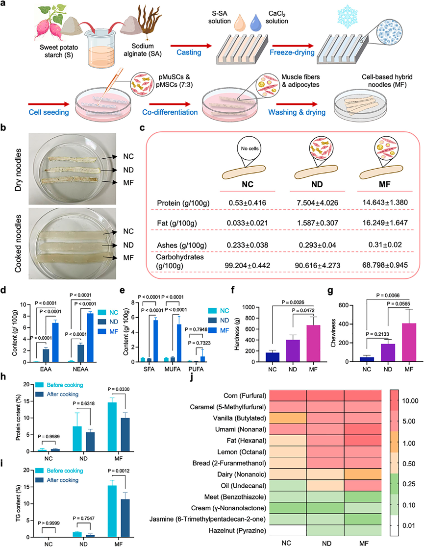 研究首先针对pMuSCs在体外长期扩增后肌源性分化潜能下降的问题,开发了pMuSC-pMSCs共培养体系,显著提升了晚期pMuSCs的肌纤维生成效率,并揭示了调控该过程的关键信号通路。在此基础上,创新性地建立了无需血清和化学诱导剂的肌-脂共分化系统,实现了猪肌纤维与脂肪细胞在同一培养体系中的高效、快速、同步生成。进一步,团队开发了具有优异力学强度和细胞相容性的可食用淀粉基支架,通过pMuSC-pMSCs三维共分化成功制备出细胞培养“肉面条”,其蛋白质含量达14.6g/100g,脂肪含量达16.2g/100g,氨基酸与脂肪酸组成均衡,质地更具嚼劲,并呈现明显的肉香味。